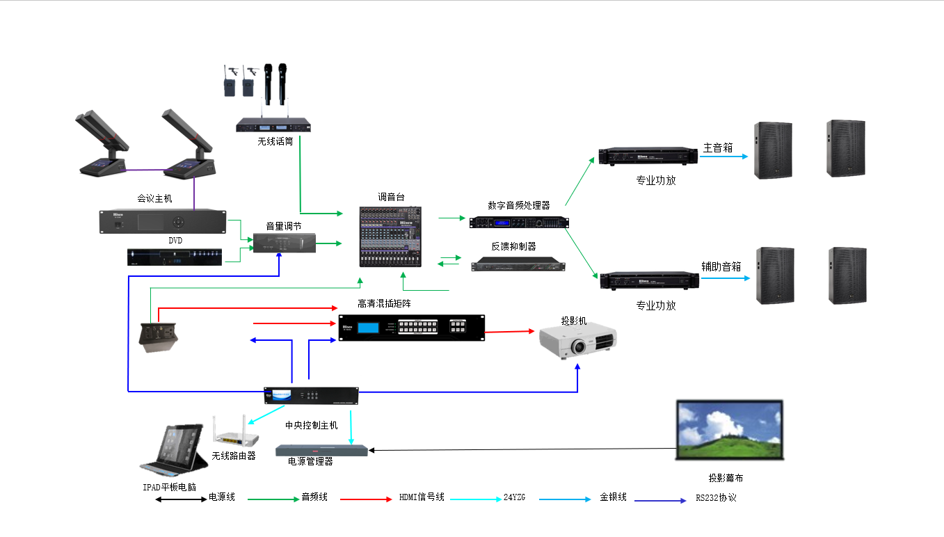 9.会议室音视频输入信号有摄像机视频信号,DVD音视频信号,笔记本/电脑音视频信号等,输出信号有投影影机信号、电视机信号,所有的音视频信号都经过视频矩阵进行切换调度;