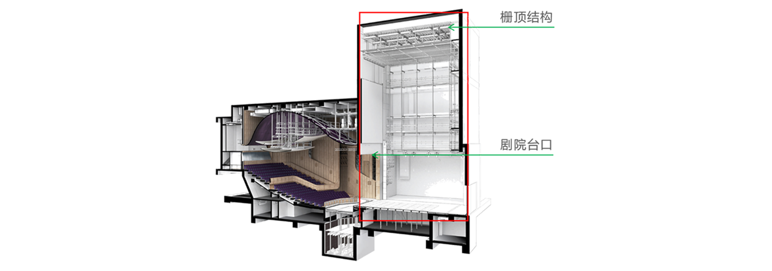 • 甲等剧场不应小于台口高度的2.5倍;乙等剧场不应小于台口高度的2倍加4.00m;丙等剧场不应小于台口高度的2倍加2.00m;丙等剧场如不设栅顶,宜设工作桥,工作桥的净宽不应小于0.60m,净高不应小于1.80m,位置应满足工作人员安装、检修舞台悬吊设备的需要。