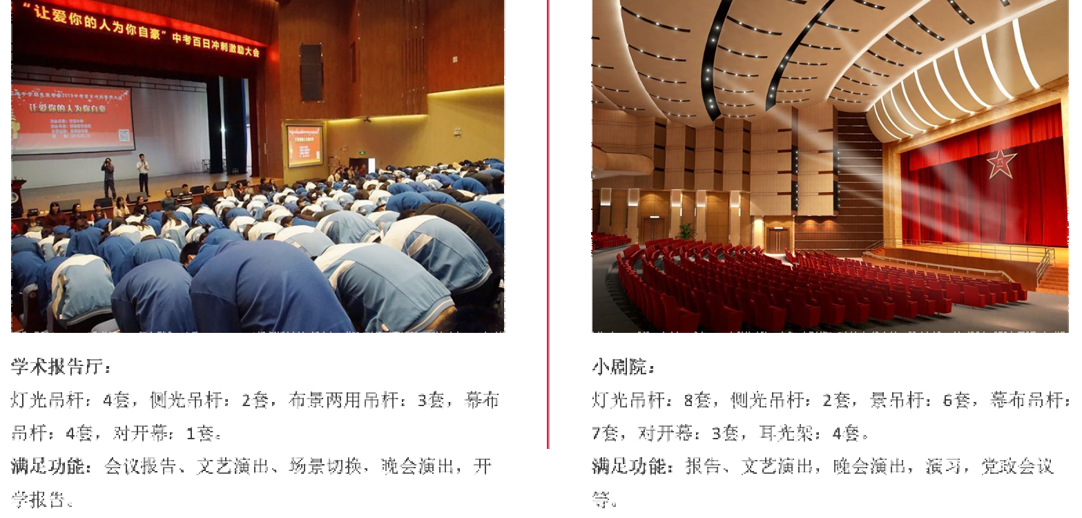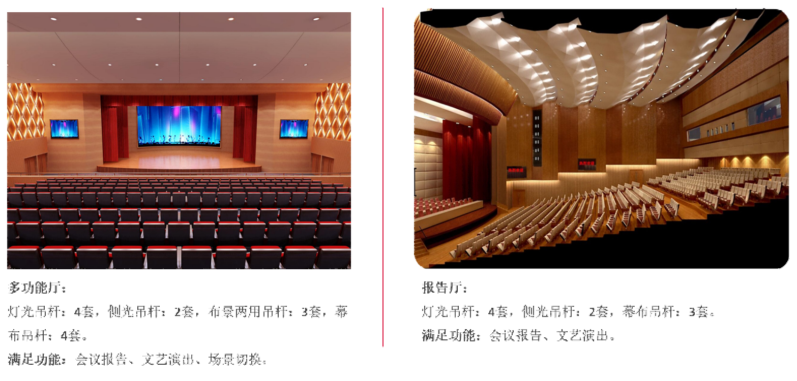 这些设备包括但不限于台上机械、台下机械、升降舞台、伸缩舞台、旋转舞台、活动假台口、灯光吊笼、灯光吊片、对开系统、电影银幕架、升降系统、电动吊杆机等。